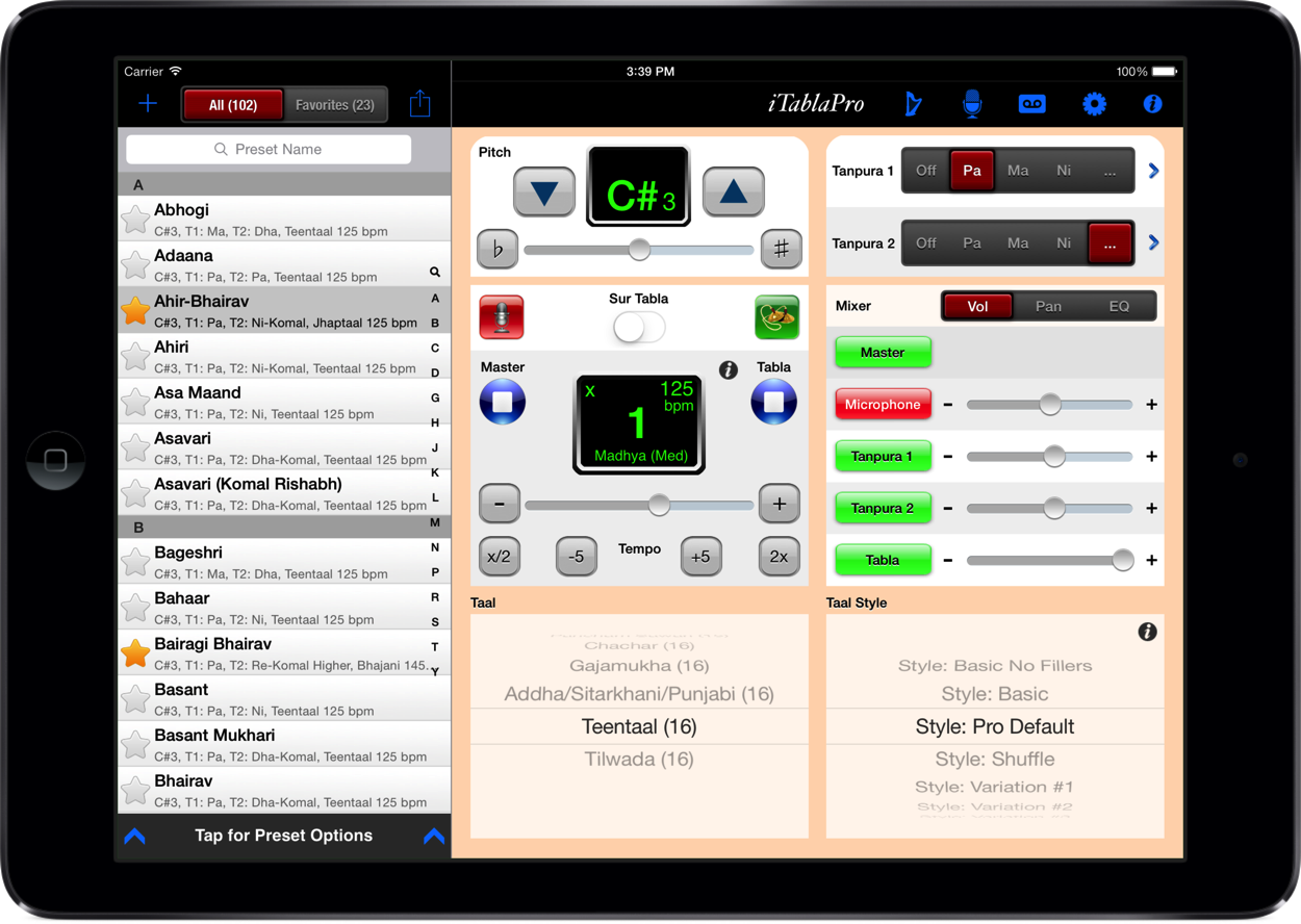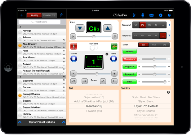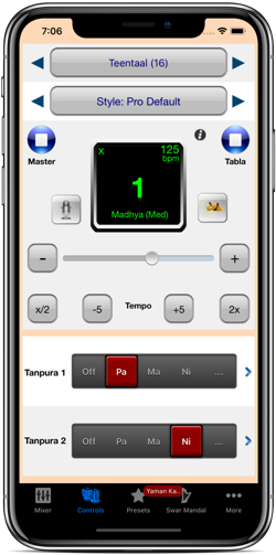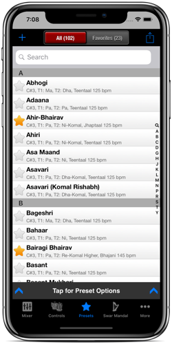 ✓Presets: Save your frequently-used combinations of pitch, tanpura & swar mandal tuning, taal & tempo as named presets. Includes presets for the 100+ most popular raags plus you can create unlimited custom presets. And now you can also export/import presets via email or iTunes File Sharing.