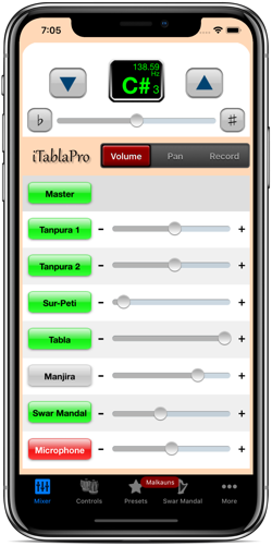 ✓SIX fantastic instruments in one app: Tabla, two 5-string Tanpuras, a Sur-Peti (Shruti-Box), a Swar Mandal, plus a Manjira all controlled by a single set of pitch controls