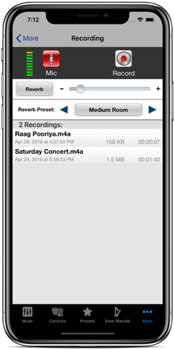 The Recording function is accessible from the More .. tab if purchased as part of the Recording Add-On. The recorder function lets you use the mic to sing or play along with the instruments and then record everything in a convenient compressed or uncompressed format.