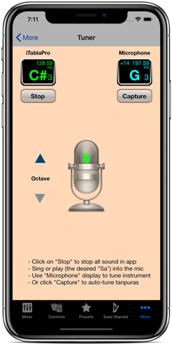 The Tuner is accessible from the More .. tab. The tuner lets you tune external instruments to iTablaPro, or vice-versa.